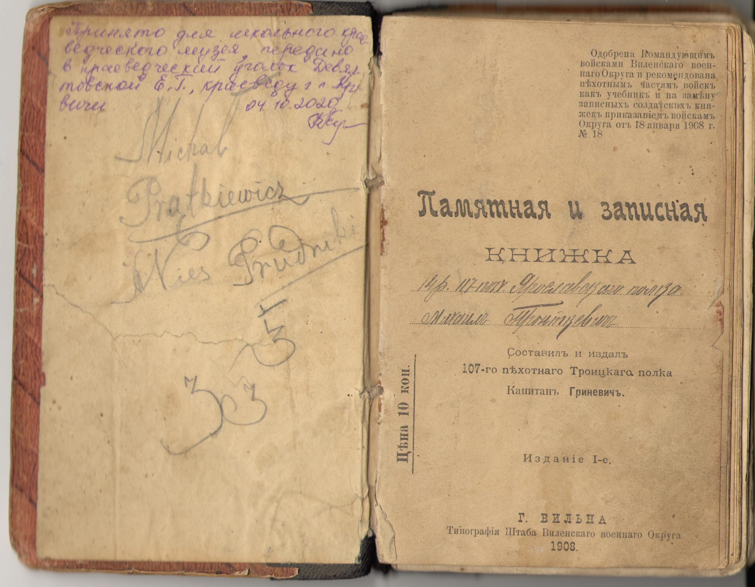 Памятная и записная книжка солдата 117-го пехотного Ярославского полка. Часть 1 Сканы книги предоставлены Аленой Девялтовской из агрогородка Кривичи Мядельского района Минской области. Вторую часть книги можно посмотреть тут.